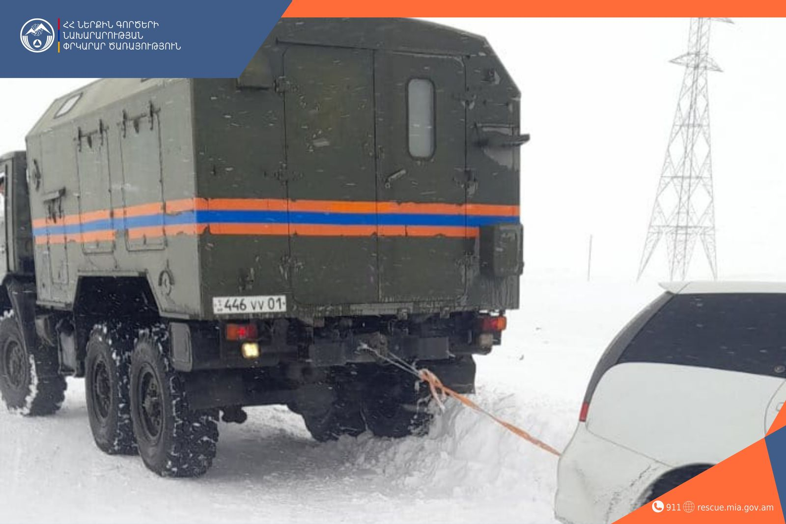 ՀՀ ՆԳՆ փրկարար ծառայությունից հայտնում են, որ փետրվարի 9-ի ժամը 08։00-ից մինչև փետրվարի 15-ը ժամը 08։00-ն ՆԳՆ ՓԾ Ճգնաժամային կառավարման ազգային և մարզային փրկարարական վարչությունների ճգնաժամային կառավարման կենտրոններ ահազանգեր են ստացվել ձյան առատ տեղումների հետևանքով տրանսպորտային միջոցների արգելափակումների վերաբերյալ։